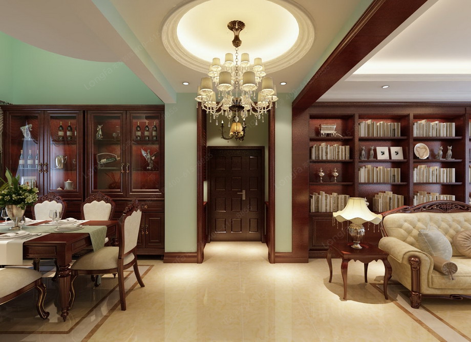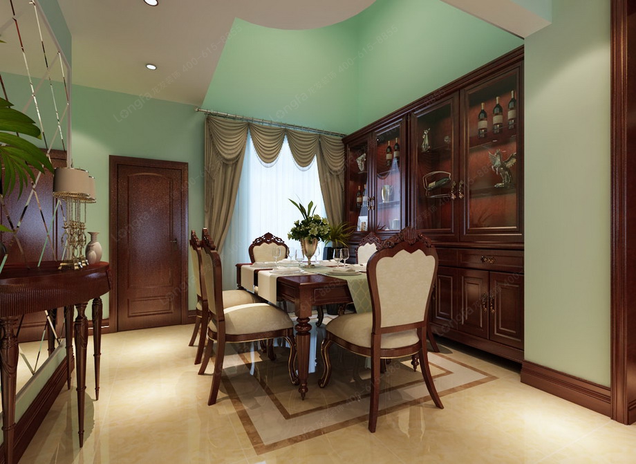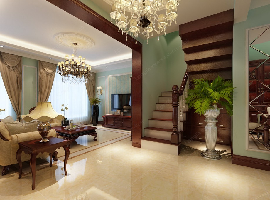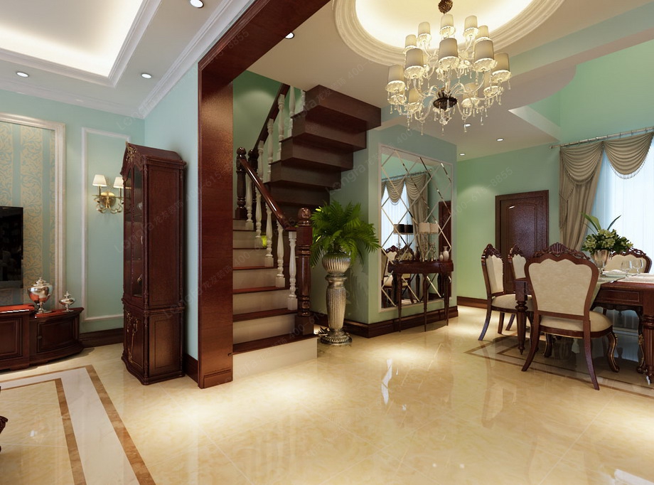 设计思路:客厅整体采用大的色块和简单的线条,搭配蓝绿色的墙漆颜色,清新舒适的感觉。客厅用进口的墙漆,简单的石膏股线勾勒出了欧式的感觉,顶面双石膏角线,配上美丽的吊顶,显得简洁而大气,大理石壁炉做客厅背景,是一个亮点,上面的装饰和配饰让可以显得有一些文化气息。电视背景墙简单和对面的墙面做一个呼应,欧式的壁灯是少不了的装饰。餐厅顶面挑空, 大大的酒柜是亮点。主卧室用的斜顶,白色,卧室前面是一个小厅,或看看电视,或喝喝茶,是主人一个私密的休闲空间。