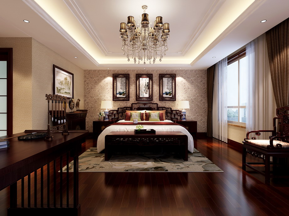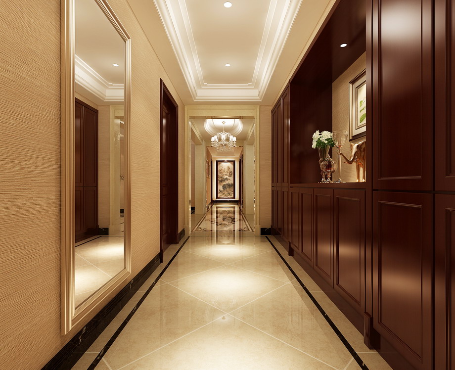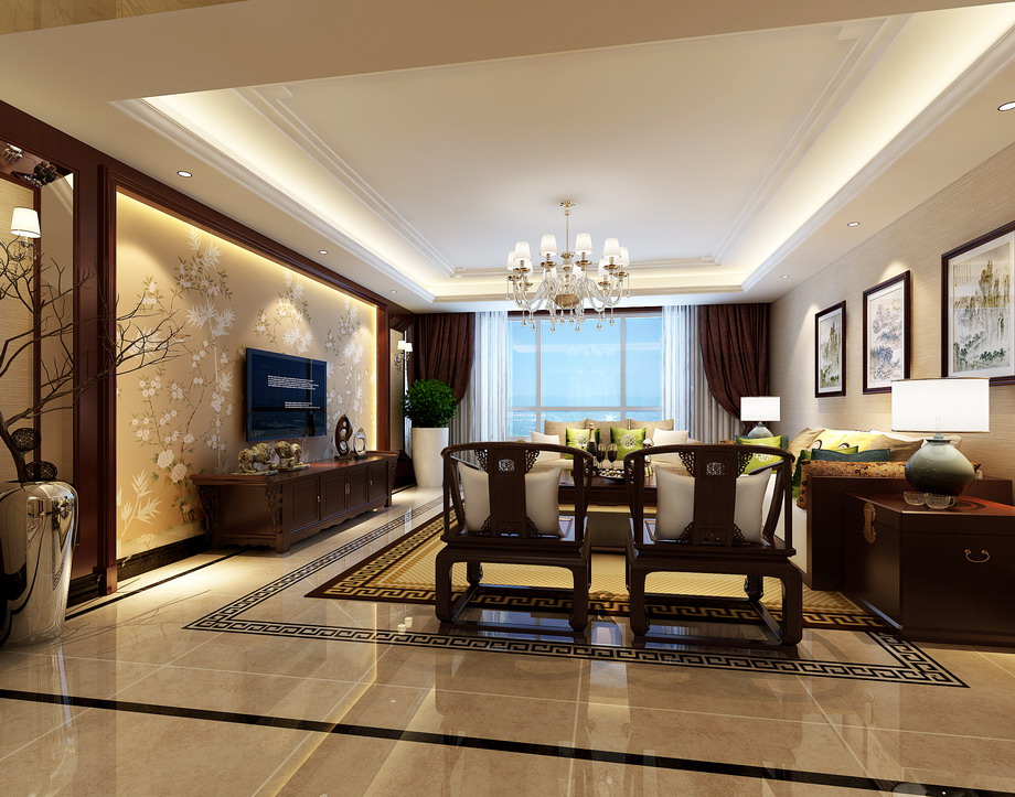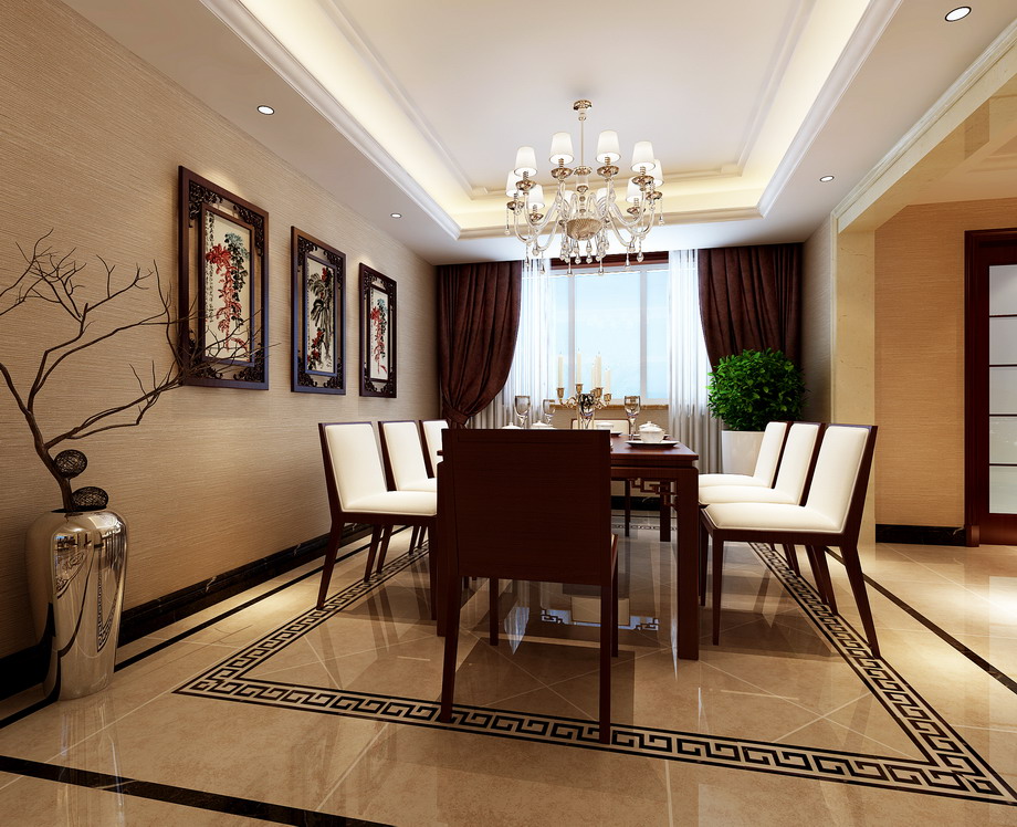 设计说明:设计上采用了中式风格,墙面的色彩,及地面的进口施釉砖拼花,然后通过顶面的造型,打造出一个具有浓郁中式气息的家居环境。后期的软装配饰更多的采用书法、挂画、瓷器陈设等东方色彩和元素来提升整体家居氛围。
